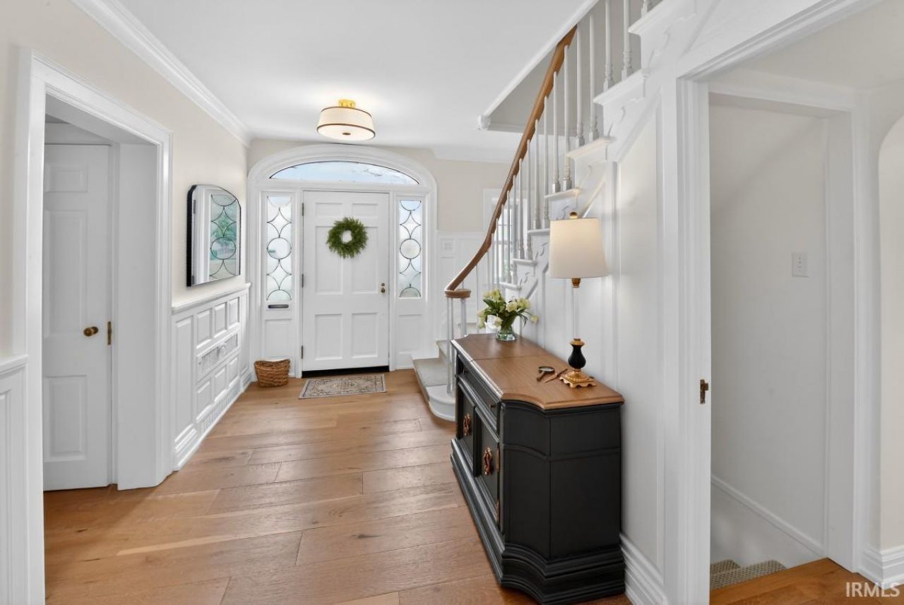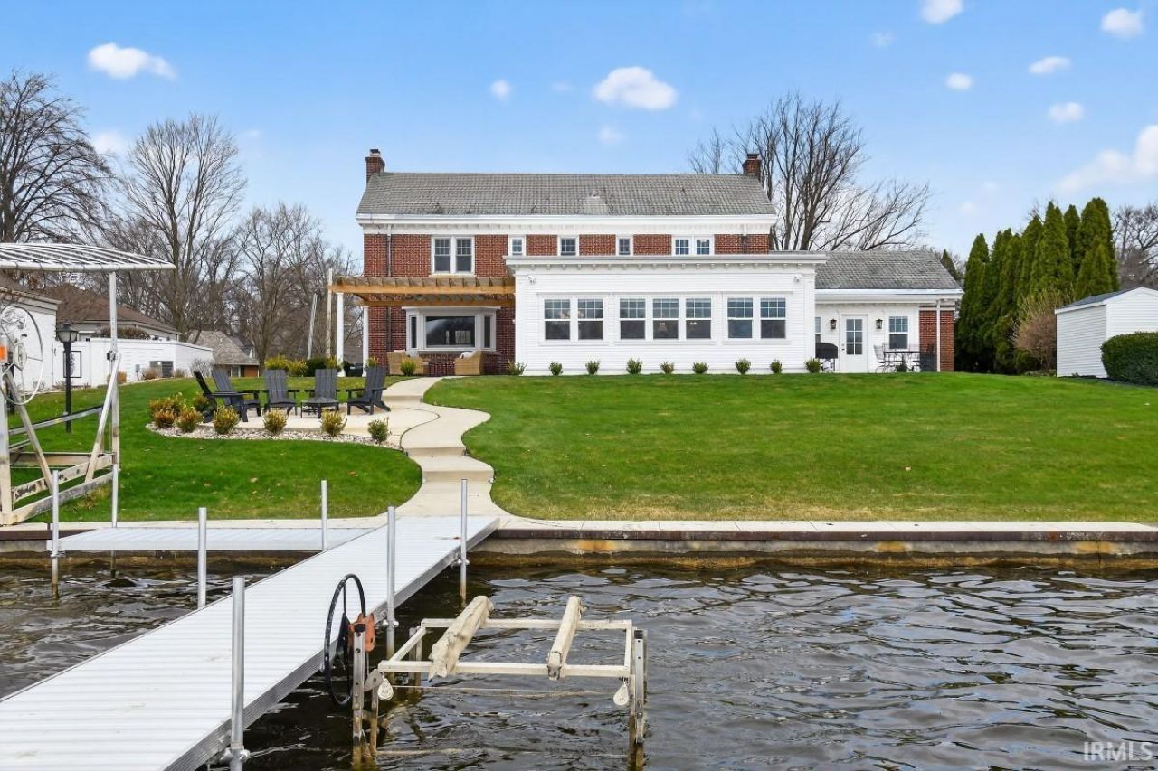 Own a piece of Elkhart history with this stunning, fully remodeled,1939 Georgian style home on the much sought after Greenleaf Blvd. Situated on 100' of pristine shoreline on the Upper St. Joseph River, this property sports a concrete seawall, refurbished in 2024, cool touch aluminum pier, a boat lift with canopy and two wave runner lifts. The 1/2 acer lawn will look lush and beautiful all summer long with the use of the wi-fi enabled digital irrigation system. Inside, you will find that the home has been, intentionally designed by a seasoned designer who expertly preserved the home's original beauty and elegance. With 4 floors of living space, including the finished lower level and walk-up attic, this home boasts plenty of space to comfortably entertain. The upper level offers 3 bedrooms, all with ensuites, abundant closet space and stunning views. After a long day on the water, you can take the elevator to freshen up in your private ensuite or relax in the cozy lower-level den. The 4th level is an insulated, fully heated and air-conditioned attic, with hardwood floors and plenty of room for extra storage or flex space. The lower level hosts a large private room, perfect for a guest bedroom, a separate den with wood burning fireplace, a full bathroom, utility room and laundry, all with stairs leading up to the attached garage which sports a gas furnace. The main level offers a beautiful entry leading you to 1 of the 2 powder rooms on the main level. At the front of the home, there is a large office space with wall to wall built in bookcases and original French doors which lead to a formal living room, complete with stunning views of the river as well as the 2nd of 3 fireplaces. A pair of closets and the elevator access complete the grand entryway. There are two stunning full kitchens with quartz counter tops, one for cooking and one for entertaining. The great room, at the back of the house is a new addition to the home. This room features the 3rd fireplace, a wet bar, and a massive dining space all overlooking the beautiful river. From the great room, step through the French doors, into the beautifully appointed, outdoor living space, covered by a custom-built wooden pergola. Finally, the main level offers a mudroom with the 2nd main level powder room that offers direct access to the spacious backyard.