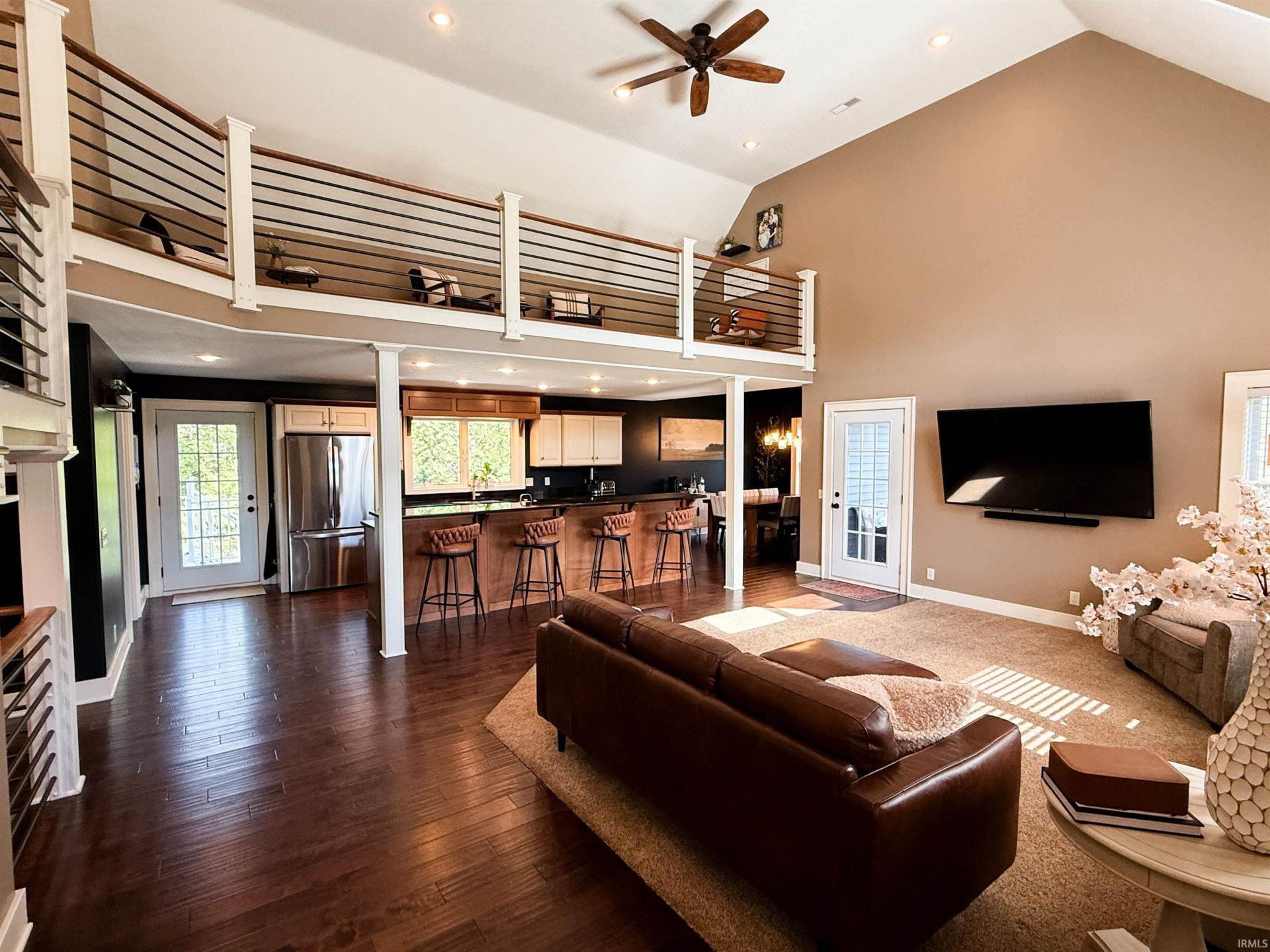 Welcome to Hunter's Crossing! This custom 2014-built standout offers a rare combination of high-end finishes and move-in-ready convenience that is nearly impossible to find at this price point. Situated within easy walking distance to the high school and City Park, this energy-efficient home boasts over 3800 SF of thoughtfully designed living space across three finished levels. The main floor greets you with stunning handscraped hardwood floors and a soaring vaulted two-story great room, accented by contemporary steel rod railings. The chef's kitchen is the focal point, featuring glazed maple cabinetry, granite countertops, and a large central island that overlooks the living area. For effortless living, the main level hosts the primary suite with a walk-in closet, a laundry room, and a functional mudroom alcove just inside the oversized, heated 2-car garage. The upper-level balcony overlooks the great room and leads to two spacious bedrooms joined by a Jack-and-Jill bath. Downstairs, the finished walk-out lower level provides even more versatility with a massive family room, a dedicated game area, a fourth bedroom, and a full bath. Outside, enjoy the privacy of a large backyard enclosed by white vinyl fencing, a charming covered porch, and a lower-level concrete patio perfect for quiet evenings. Experience custom quality, outstanding style, and an unbeatable location- ready for you to call Home!