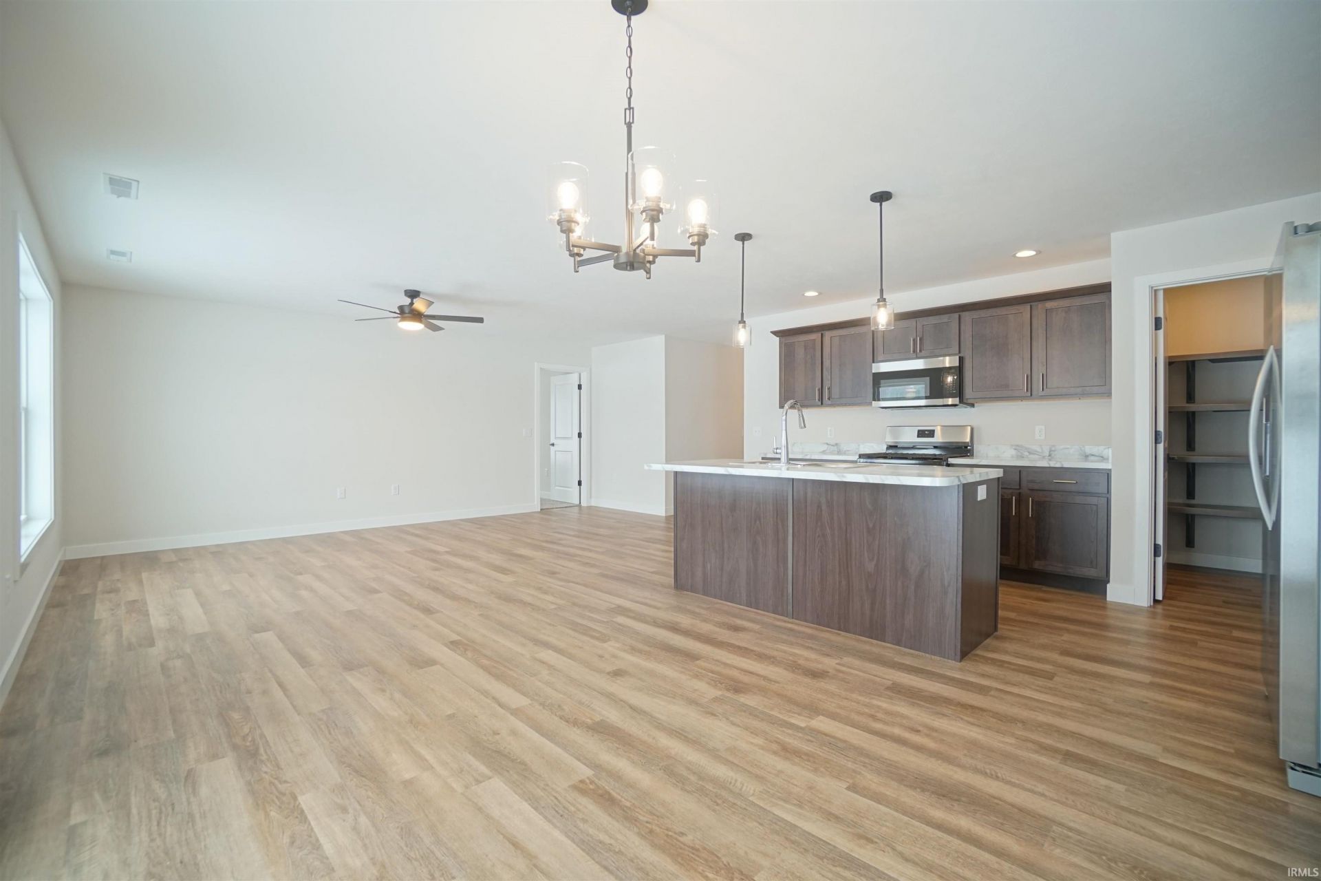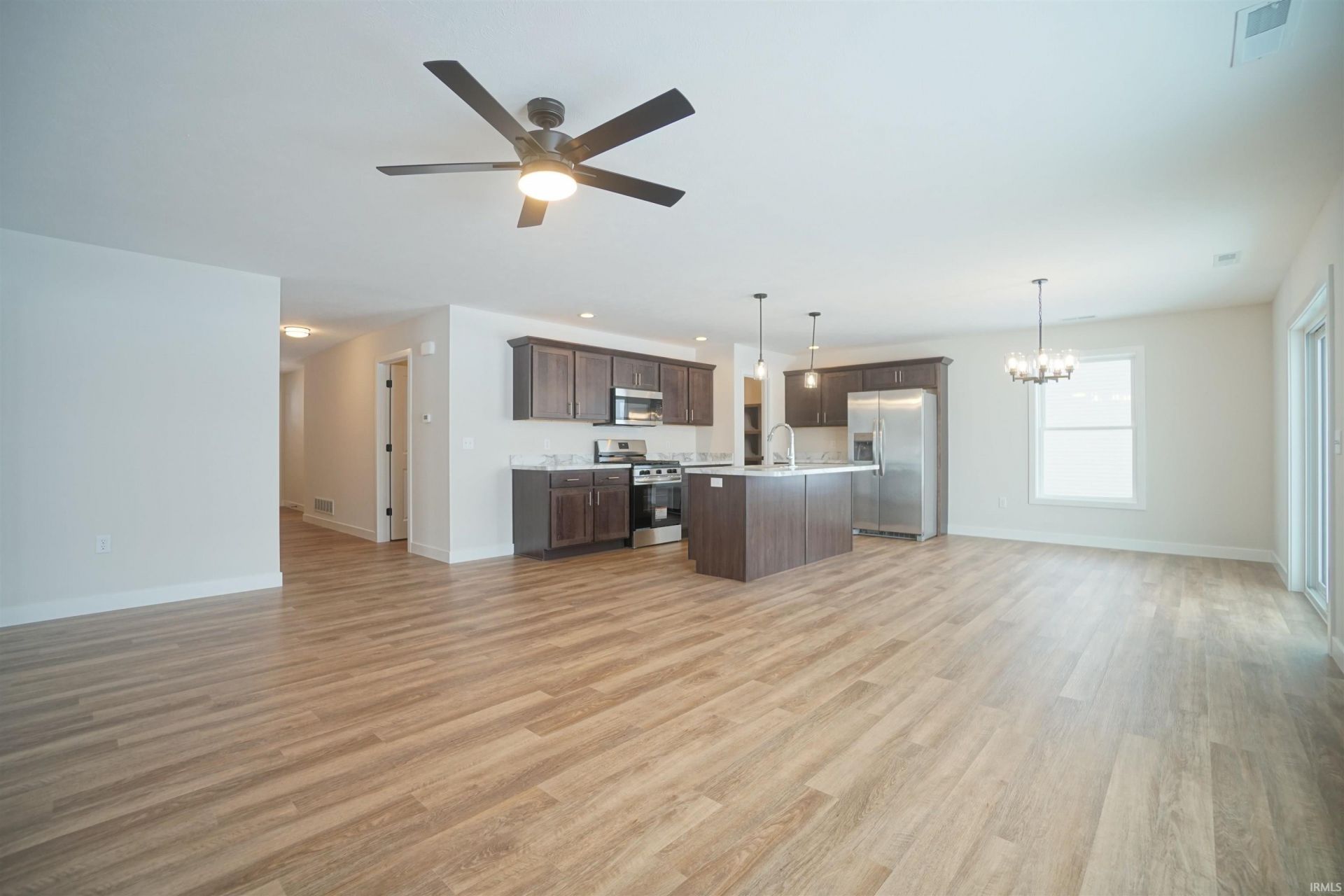 Brand new and ready to move into, 3 bedroom, 2 bathroom, 1,530 sq. ft. home with an attached 3 car garage, on a professionally landscaped, seeded, and irrigated lot with city sewer, city water, and fiber internet. This open floorplan house has a split bedroom design with generously sized bedrooms and a conveniently placed full bathroom for guests and bedroom #2 & #3. The primary bedroom suite features a double vanity, walk in shower and walk in closet. The large living room is connected to the fully appointed kitchen with custom stained hickory cabinets, stainless appliances, kitchen island breakfast bar, a large walk in pantry with custom wood shelving, and the dining room with slider door access to the patio overlooking the backyard. Quality construction: 2 x 6 exterior walls with R-20 insulation, attic insulation of R-40, insulated windows with lifetime warranty, LVP wood plank flooring, main level laundry with utility sink, etc. Outside you will find a maintenance free exterior with vinyl siding and front stone accents. The Eastfield subdivision offers the benefits of city utilities with an "In the country" setting.