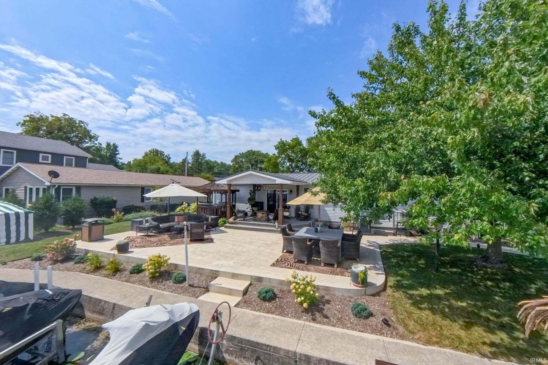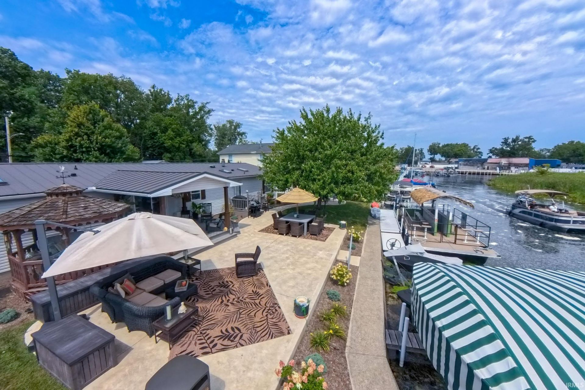 100' OF CHANNEL FRONTAGE - this is the largest lot on the main channel, measuring 100'x120'. it could also be divided into two individual 50' lots. Two back lots and a barn are included. Enjoy a short 2-minute boat ride to Lake Wawasee & 7 minutes to Syracuse Lake. Take in the peaceful sounds and views from the deck or spacious patio with a natural fire pit. From this home, you'll see some of nature's finest creatures, including sandhill cranes, deer, ducks and graceful swans. You can walk through historic Oakwood, and if you'd like to dine out, you can go by boat to Oakwood, The Frog, or Channel Marker - or travel by foot or golf cart. All amenities are just seconds away. This home features 3 bedrooms, 2 full bathrooms. The large primary bedroom includes 2 separate vanities, Jacuzzi tub, and a separate shower. The other two bedrooms are on the opposite side of the home and share a full bathroom and linen closet. The family room is open to the dining room and kitchen dinette area. The kitchen offers quartz countertops, abundant cabinetry, and a nine-door floor-to ceiling pantry. The laundry room includes a closet, sink, and additional cabinets. Additional features include vaulted ceilings, a floor-to-ceiling stone fireplace, and ample storage throughout. The back property consists of 2 lots totaling 100X90' and includes a 30x40 pole barn. The barn features electricity, two large overhead doors with remote access, a concrete floor, metal ceiling, OSB-lined walls, 15" of blown insulation in the ceiling, and 8" of open-cell spray foam in the walls. This property is being offered as one tract, including both channel front and back lots.