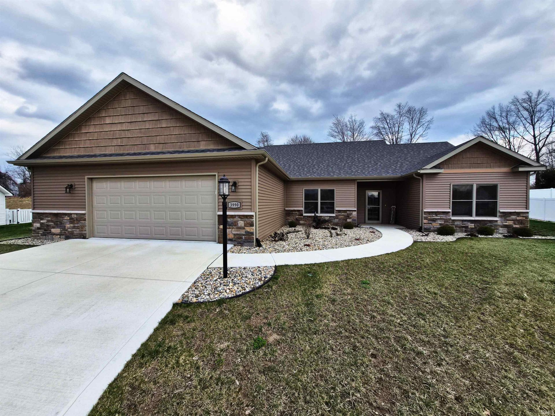 Like brand new, 1 1/2 year old custom built home in the Belle Augusta subdivision conveniently located on the northeast side of Warsaw. 4 bedroom, 2 1/2 bathroom, 1,828 sq. ft. family home with an oversized (28' x 24') 2 car attached garage with floor drain along with hot & cold water. This is a one story home, no steps, open - split bedroom floorplan home with many interior & exterior upgrades. The covered front porch brings you into the foyer that connects to a bedroom (currently used as an office), the large living room with stone surround gas log fireplace that attaches to the fully appointed kitchen with custom hickory cabinets, quartz countertops, tile backsplash, kitchen island with breakfast bar & the stainless appliance package. The dining room is just off the kitchen with access to the large patio to enjoy grilling and a quiet place to sit and enjoy nature. A hallway off the kitchen takes you past the walk-in pantry and into the large primary bedroom suite with double sink vanity, walk-in shower, and walk-in closet. The attached garage is connected to the kitchen by a hallway/mudroom that brings you past a 1/2 bathroom, hook & locker storage area, and the good sized laundry room. 2 additional generously sized bedrooms and the 2nd full bathroom with tub/shower complete the floorplan. Maintenance free exterior with premium vinyl siding and front stone accents and professional landscaping. Some of the many upgrades are: 9' Ceilings, Sliding trays in kitchen cabinets, Anderson tilt-in windows, Under cabinet lighting, Window coverings, Quartz countertops, Tile backsplash, Electric range w/convection oven & air fryer; Front storm door, Horizontal and shake siding, Retaining wall, Oversized patio, Landscape stone & edging, Buried downspouts, plus many more. You have to see this home in person to appreciate all it has to offer the new owners. K Connect fiber internet is connected to this house.