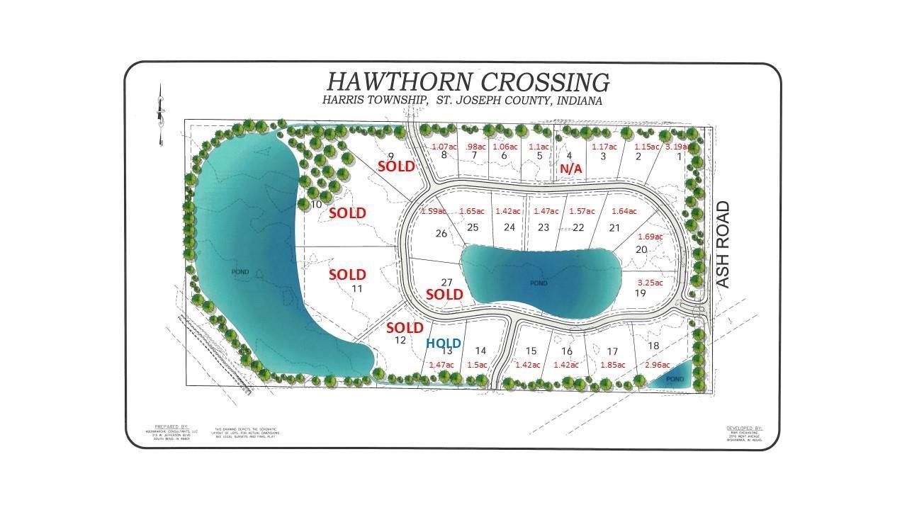 Your dream home starts at Hawthorn Crossing of Granger, where we are thrilled to officially announce the release of brand-new, oversized custom lots spanning over an acre each. These build-ready homesites offer the rare luxury of space and privacy within a community you'll love, providing the perfect canvas to start construction with local premier builder Kline Custom Homes. Home and Lot Packages in this premium community will be beginning from $1M. Nestled on the west side of Ash Road between Douglas and Cleveland Roads, this prime location is situated within the award winning Penn School District (Horizon Elementary, Discovery Middle, Penn High School). Whether you envision sprawling outdoor living areas or a unique interior floor plan, we are ready to help you design a space that fits your needs perfectly. Please note that because our streets are brand new, they may not yet appear on GPS; to visit Hawthorn Crossing, please navigate to 53699 Ash Rd, Granger, IN.