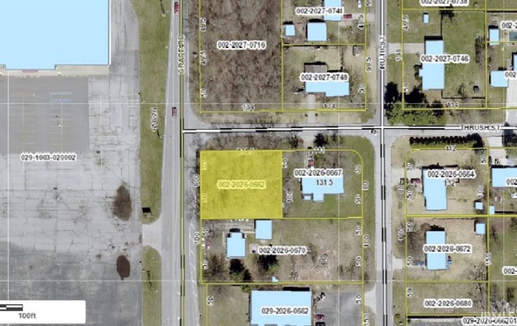 Nice parcel at southeast corner of Grape and Thrush. Tax info shows 100' frontage on Grape Rd and 131.5' on Thrush Street. The Mishawaka water department says that they have a water main at Thrush St.