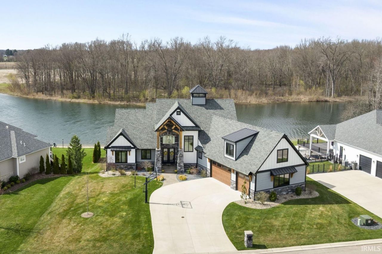 Set within the coveted Bradford Shores community, this one-of-a-kind Modern Mountain estate by award-winning Spalding Design Group offers over 7,000 square feet of luxury living with breathtaking lake and nature preserve views. A dramatic two-story entry with cedar beams, custom details, and a cupola sets the tone, complemented by metal roof accents for a refined mountain-modern aesthetic. Inside, maple hardwood floors and 8-foot doors lead to a stunning two-story great room featuring a floor-to-ceiling stone fireplace, custom built-ins, and expansive windows framing the water. The open-concept kitchen showcases a 17-foot arched island with seating for seven, premium appliances, and a spacious walk-in pantry. The main floor primary suite boasts vaulted ceilings, serene views, and a spa-like bath with jetted tub, oversized shower, and expansive walk-in closet with direct laundry access. The finished lower level offers incredible additional living space with two bedrooms, a full bath, rec room, and home theater. With 5 spacious bedrooms and 4.5 baths, there is room for everyone. Additional highlights include an in-ground saltwater sports pool, 3-car garage, an upper balcony and walkout patio from the basement. This is a home you have to experience in person. Schedule your showing today.