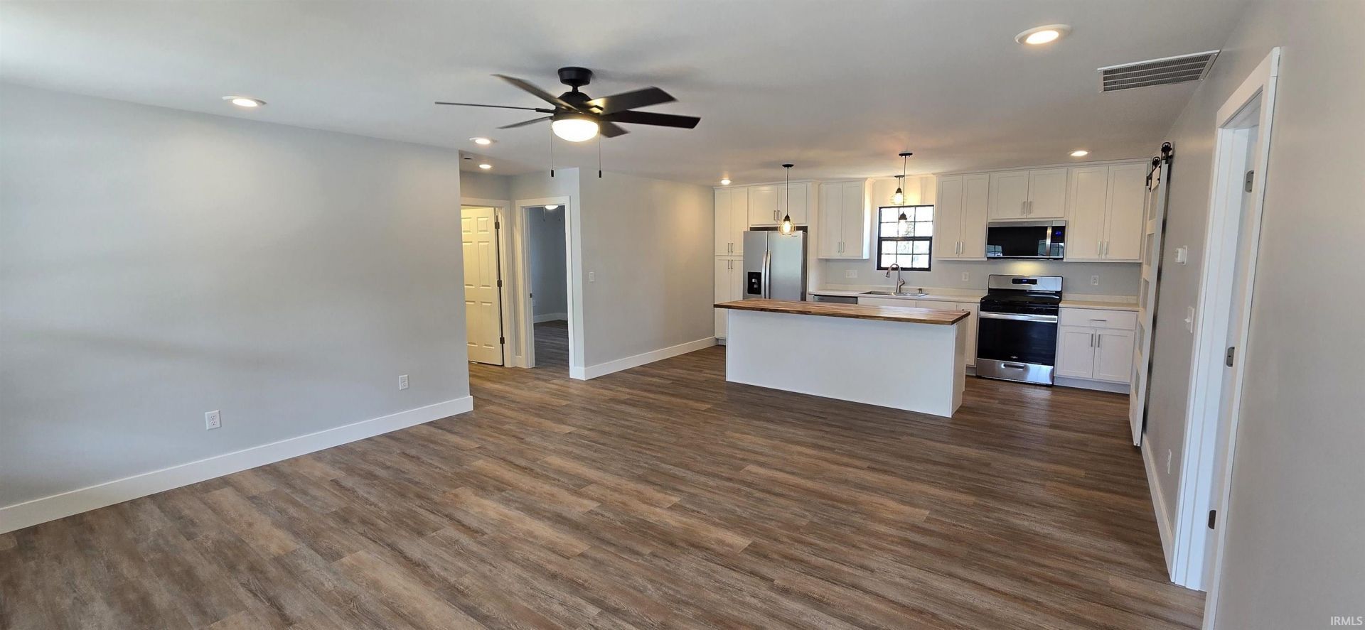 Brand new construction in North Judson with the finishes buyers are looking for. This 3-bedroom, 2-full-bath ranch offers a smart and efficient floor plan featuring luxury vinyl plank flooring throughout, white shaker cabinetry, butcher block island, stainless steel appliances including refrigerator, gas range, microwave and dishwasher, and a sliding barn door accent. The open kitchen and living layout is bright and functional with recessed lighting and contemporary pendant fixtures. The exterior presents beautifully with board-and-batten siding, black trim windows, and a covered front porch with wood beam detail. Central air throughout. Lot survey currently underway for legal separation of Lot 2, approximately 0.52 acres. Move-in ready with zero deferred maintenance. A rare opportunity to own new construction in town at an accessible price point. Call today to schedule your private showing.