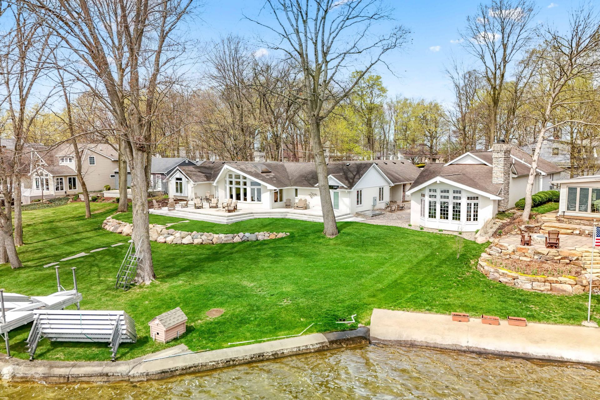 Waterfront living at its finest! This rare opportunity on highly desirable Coldwater Lake offers not just one, but two homes--a main residence and a separate guest house--plus an additional back lot with garage, all with 135 feet of private water frontage. Properties on the Island seldom hit the market, making this your chance to secure the ultimate summer retreat. Step inside the main home and youre immediately welcomed by expansive windows that showcase breathtaking water views, soaring cathedral ceilings, a cozy fireplace, and an open-concept kitchen, dining, and living area designed for both comfort and entertaining. The kitchen has stainless steel appliances and a center island with eating space. 4 spacious bedrooms and 3 full baths. The primary with ensuite, offers a walk-in closet along with a secondary closet with organizers, plenty of natural light and french doors leading to the patio. Youll find a designated desk/office space, and several built-ins throughout the home. Family room could be used for lounging or overflow sleeping space, complete with tray ceilings,entertainment center and designated closet. Plenty of room to store all of the extras in the partially finished basement and two car attached garage. The massive 3 tiered patio that was recently completed spans from one side of the home to the other making this an entertainers paradise. Beautifully designed hardscape, featuring elegant slate steps, will catch the eye of boaters passing by on the water.The guest home is sure to be a retreat for all. A very unique space with custom wooden beams, large chandelier, a safe room to store all the valuables and for those chilly nights enjoy a game of pool or cozy up by the stone fireplace. Wet bar complete with refrigerator, ice maker, dishwasher, back lit cabinets and quartz countertops. The bedroom offers plenty of comfort, space and privacy. The garage has storage cabinets, a place to park the car and the golf cart. Parking for all of the guests is never a problem with the back lot with garage. Dont miss your opportunity to live the Island life this Summer. This company makes no warranty or representations about the contents of this data including room sizes & sq. footage. It is the responsibility of the parties looking at the property to satisfy themselves as to the accuracy of this information. Taxes were obtained from the local assessor and the taxes could change for the buyer after a closed transaction.