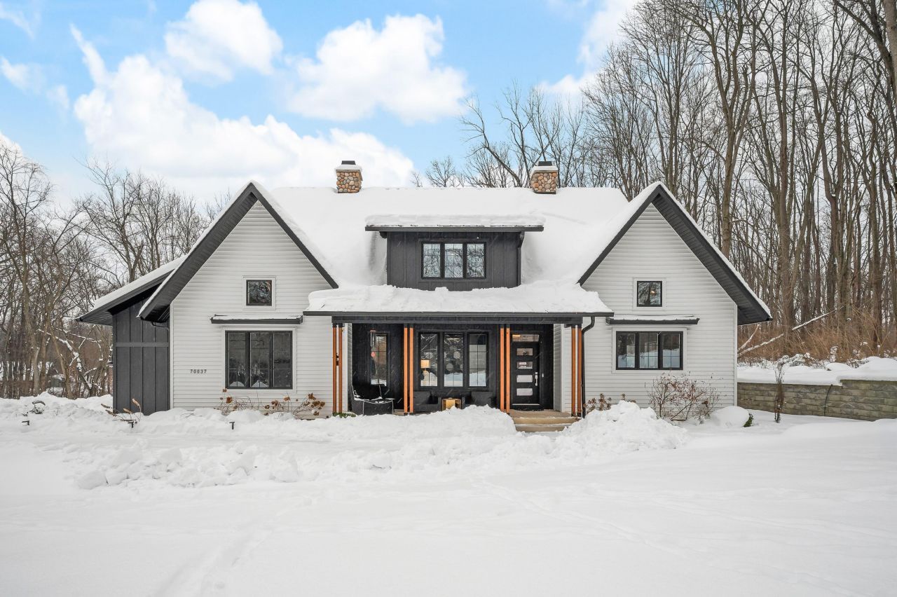 Built in 2021, this 4 bedroom, 3.5 bath contemporary farmhouse is perfectly nestled on 4.4 Acres providing wooded privacy & seclusion. The addition of the 40x24 Pole Barn in 2024 completes the private oasis that includes a winding driveway, serene property & seamless connection to nature. Covered front porch welcomes you into this thoughtfully designed home w/custom features throughout. Main level consists of an appointed home office, open concept layout & solid hickory hardwood floors. Convenient mudroom & laundry located as you enter from the garage. Chef inspired kitchen features vaulted ceiling, large island, quartz countertops, dual wall oven, downdraft gas cooktop & beautiful walk-in pantry. Kitchen seamlessly flows into the dining area and great room which also includes a vaulted ceiling & impressive floor to ceiling stone gas log fireplace. Spacious main floor primary suite offers en-suite bath w/dual vanities, large tiled shower, walk-in closet & exceptional wooded views. Upper level offers 2 bedrooms, each with a walk-in closet and access to the jack & jill full bathroom. There is also an additional laundry hook-up in the oversized hall closet. Walkout basement consists of the 4th bedroom with a full bath located right next to it (making it perfect for guests), recreation room, family room & utility room that offers tons of storage space. Large windows and slider door flood the space with natural light which is also true for the main level. Large deck is perfect for entertaining & relishing in the gorgeous view of the wooded property. Even though you are tucked back in the woods there is High Speed Fiber Optic Internet to allow you to work from home if needed or just to make everyday living easy. Consisting of 2 wooded parcels, not only would this special place be a great weekend retreat, but it would also be a wonderful full-time residence.