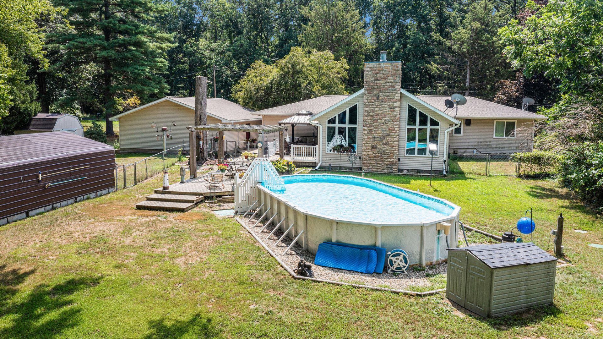 Beautifully maintained 3-bedroom and 1.5 bathroom situated on 4.23 acres offers space, outdoor living yet minutes from shops/businesses. The spacious Great Room boasts vaulted wood beam ceilings and a floor-to-ceiling wood-burning fireplace. The updated kitchen features oak cabinetry, granite countertops, double ovens and plenty of workspace. The primary offers a private half bath en suite. There is a bonus 520sqft space off the kitchen (not included in the sqft measurements) that is known as The Game Room, there is a wall heater. Outside, enjoy the fenced in deck area and refreshing pool. The 3 car garage (30 x 32) was built in 2015, also a storage shed and carport. With numerous updates, this home is ready for you to move right in!! Roof (2018), Gutters (2023), New Well (2021), New Septic (2024)