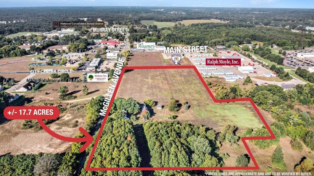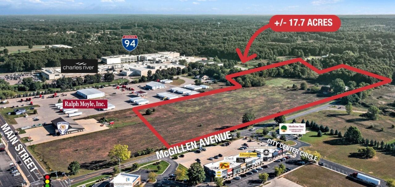 Prime land development opportunity on McGillen Avenue in Mattawan, just east of the McGillen & Main Street intersection. The site sits immediately south of I-94 and the Charles River campus and offers strong potential for commercial development (subject to approvals). The trade area is expanding, with 28,000+ residents within five miles and a significant daytime population within ½ mile driven by Charles River to the north; Mattawan Consolidated Schools are less than one mile west.
